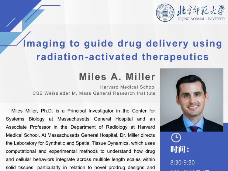 On December 4, 2024, Dr. Miles A. Miller from Harvard Medical School and Massachusetts General Hospital delivered a captivating talk titled “Imaging to Guide Drug Delivery Using Radiation-Activated Therapeutics” via Zoom at the College of Chemistry, Beijing Normal University. Dr. Miller, a leading expert in computational and experimental pharmacology, shared his team’s groundbreaking research onContinue reading “Dr. Miles Miller Delivers Inspiring Talk on Imaging-Guided Drug Delivery” - Prof. Tiancong Zhao Delivers Inspiring Talk on Mesoporous Nanomedicine at Cao Group
