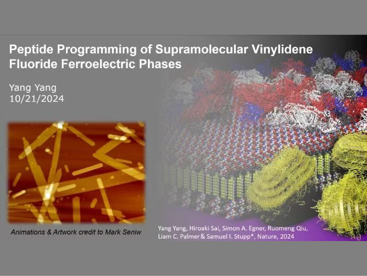 On October 21, 2024, Dr. Yang Yang from Northwestern University delivered an enlightening talk at the Cao Group on his pioneering work in soft, sustainable ferroelectric materials. Dr. Yang, a key researcher in Professor Samuel I. Stupp’s lab, showcased a breakthrough in creating flexible nano-sized ribbons that can be charged to store energy or recordContinue reading “Dr. Yang Yang Presents on Soft Electroactive Materials at Cao Group”